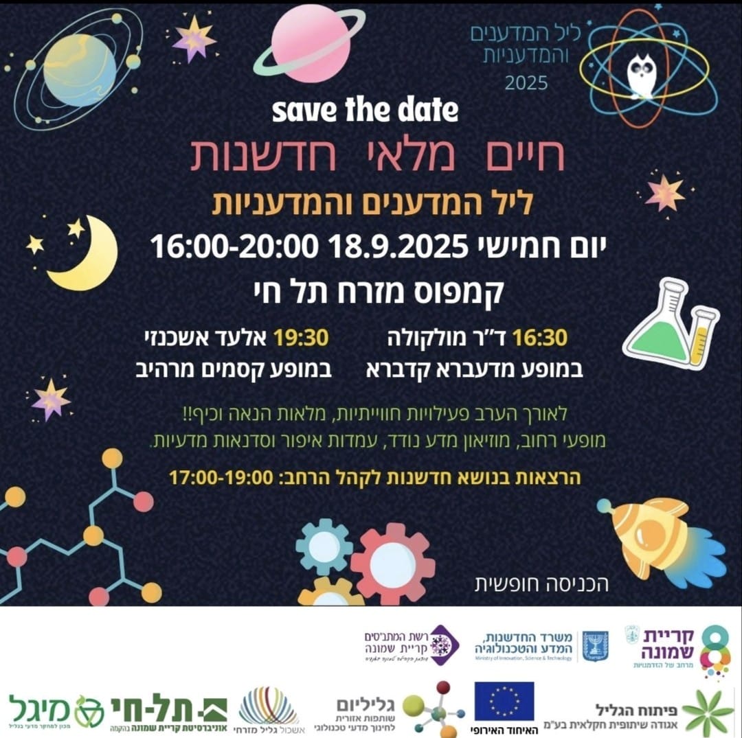 מכון המחקר מיגל ותל חי אוניברסיטת קריית שמונה בהקמה, מתרגשים להזמין אתכם לערב שכולו חוויה מדעית לכל המשפחה- "ליל המדענים והמדעניות"- בנושא חיים מלאי חדשנות!!